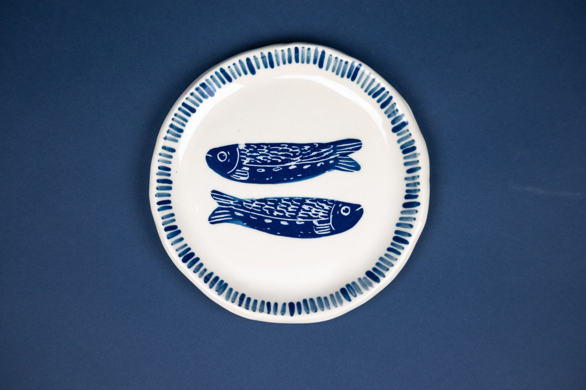 Dive into whimsical dining with this hand-built and individually-illustrated ceramic "Fish Duo Appetizer Plate." This charming piece adds a touch of quirky elegance to your tableware.